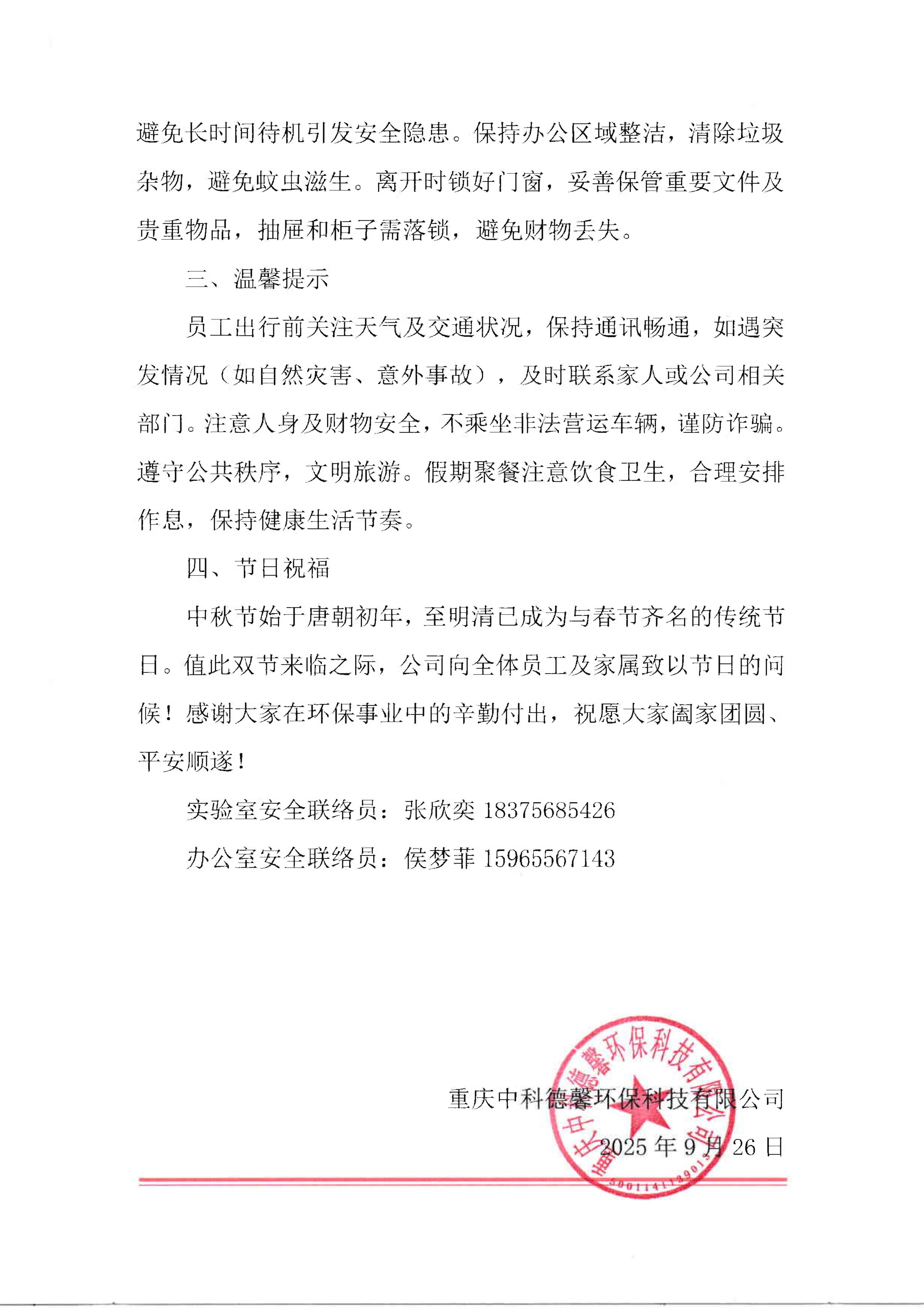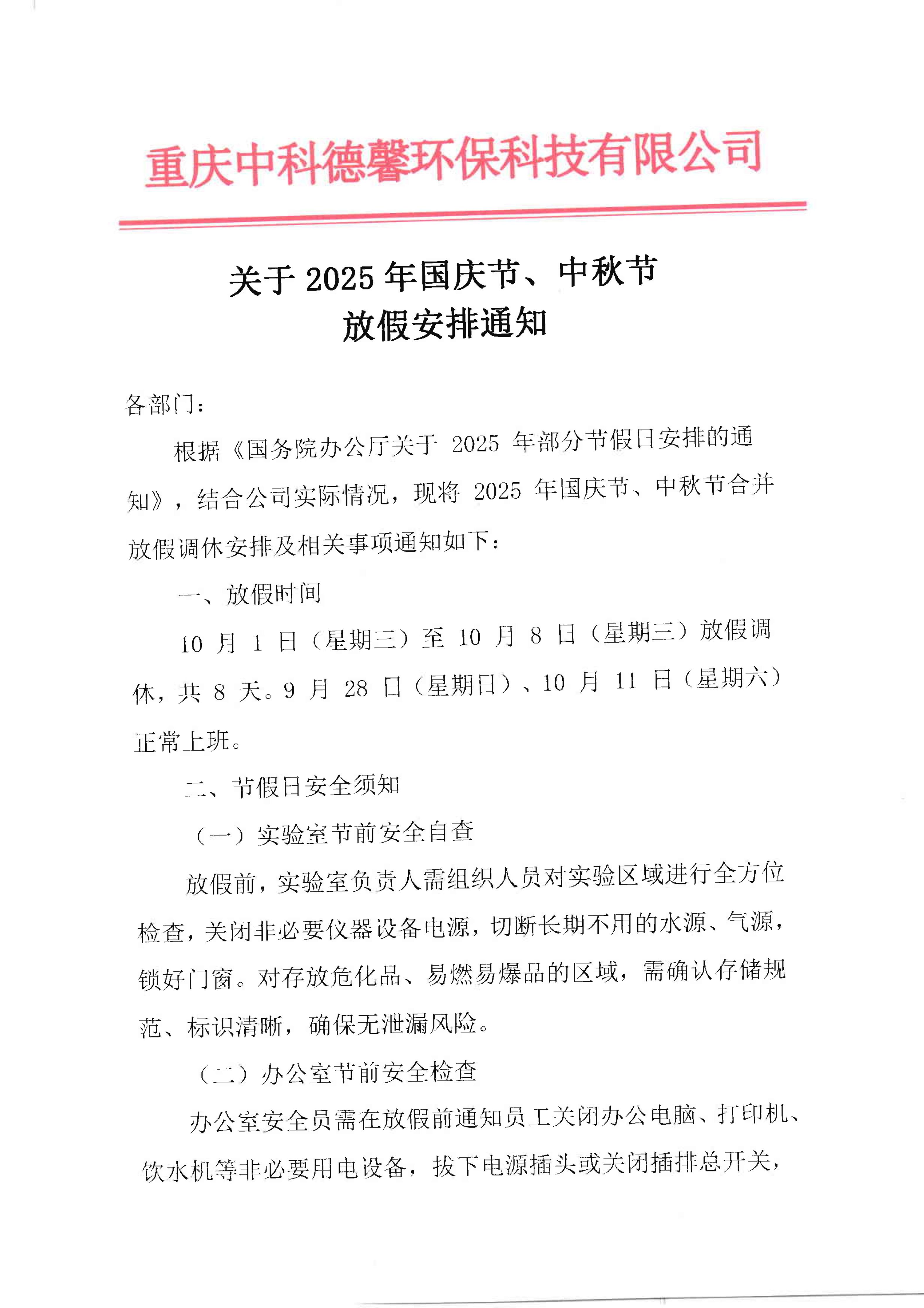 中科德馨關于2025年國慶節、中秋節放假安排通知